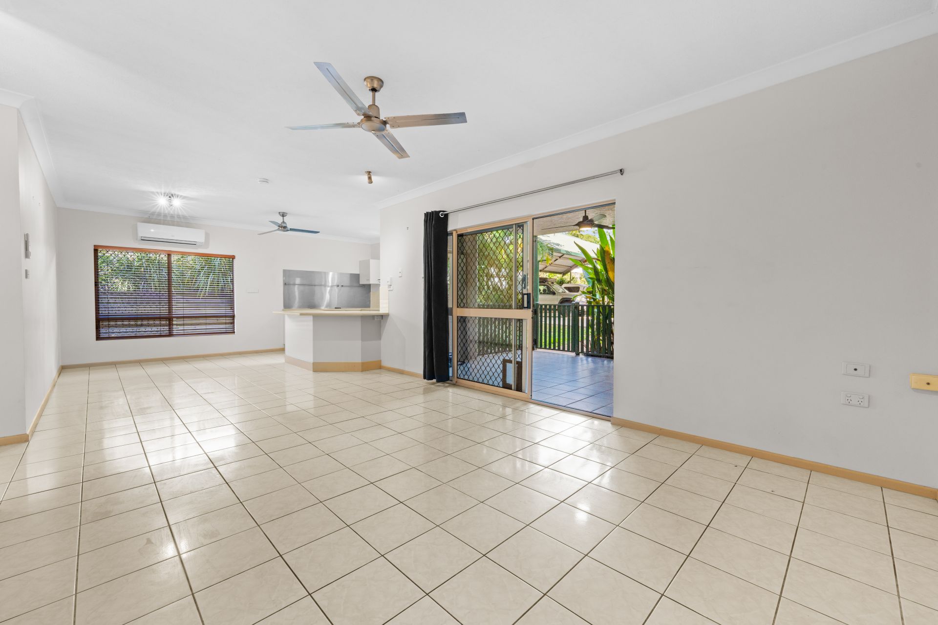 Step inside to a spacious open-plan living and dining area, fully tiled for ease of maintenance and comfort. The generous kitchen is well-appointed with ample bench and cupboard space, a breakfast bar for casual meals, and a practical servery window connecting to the private patio, ideal for entertaining year round.