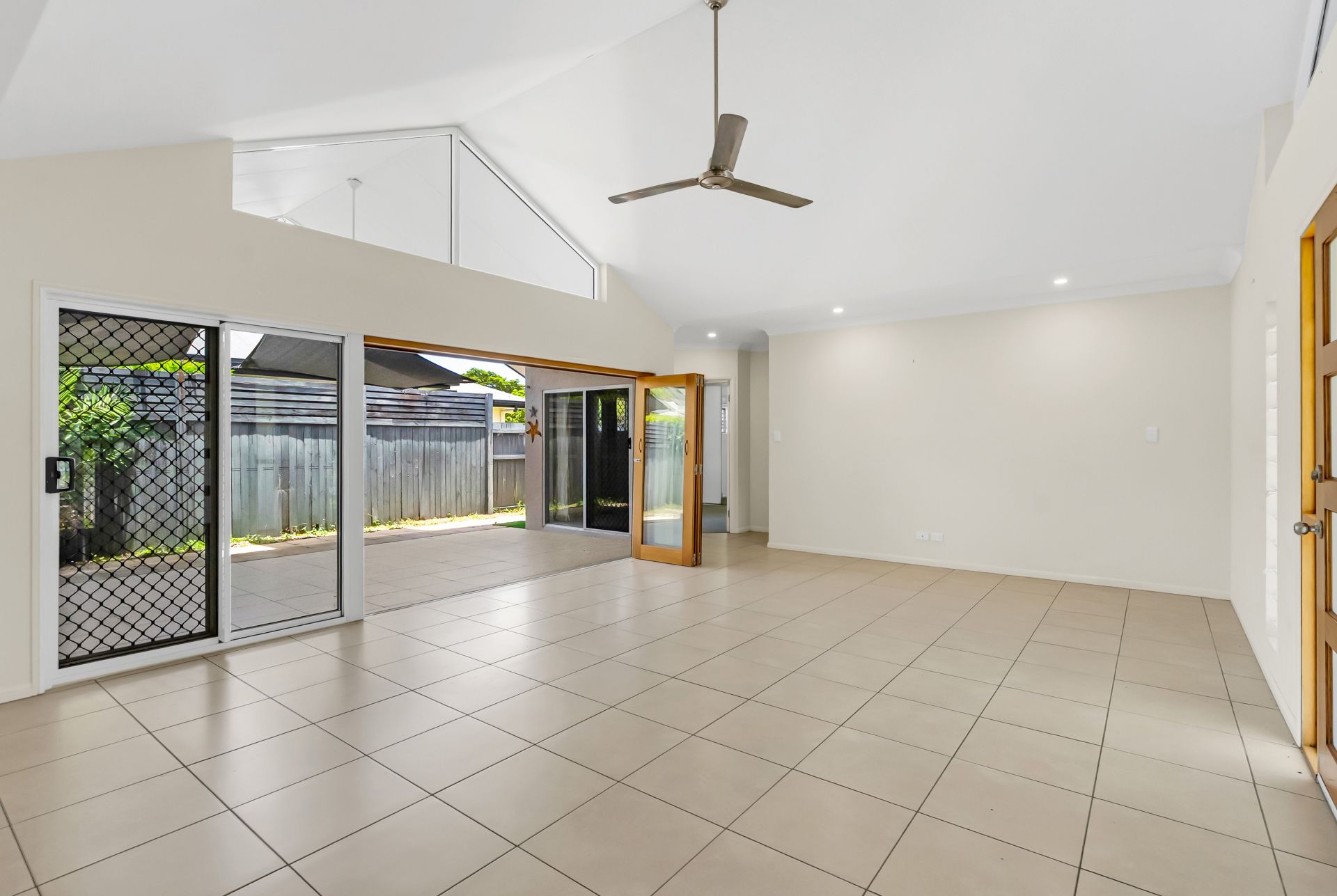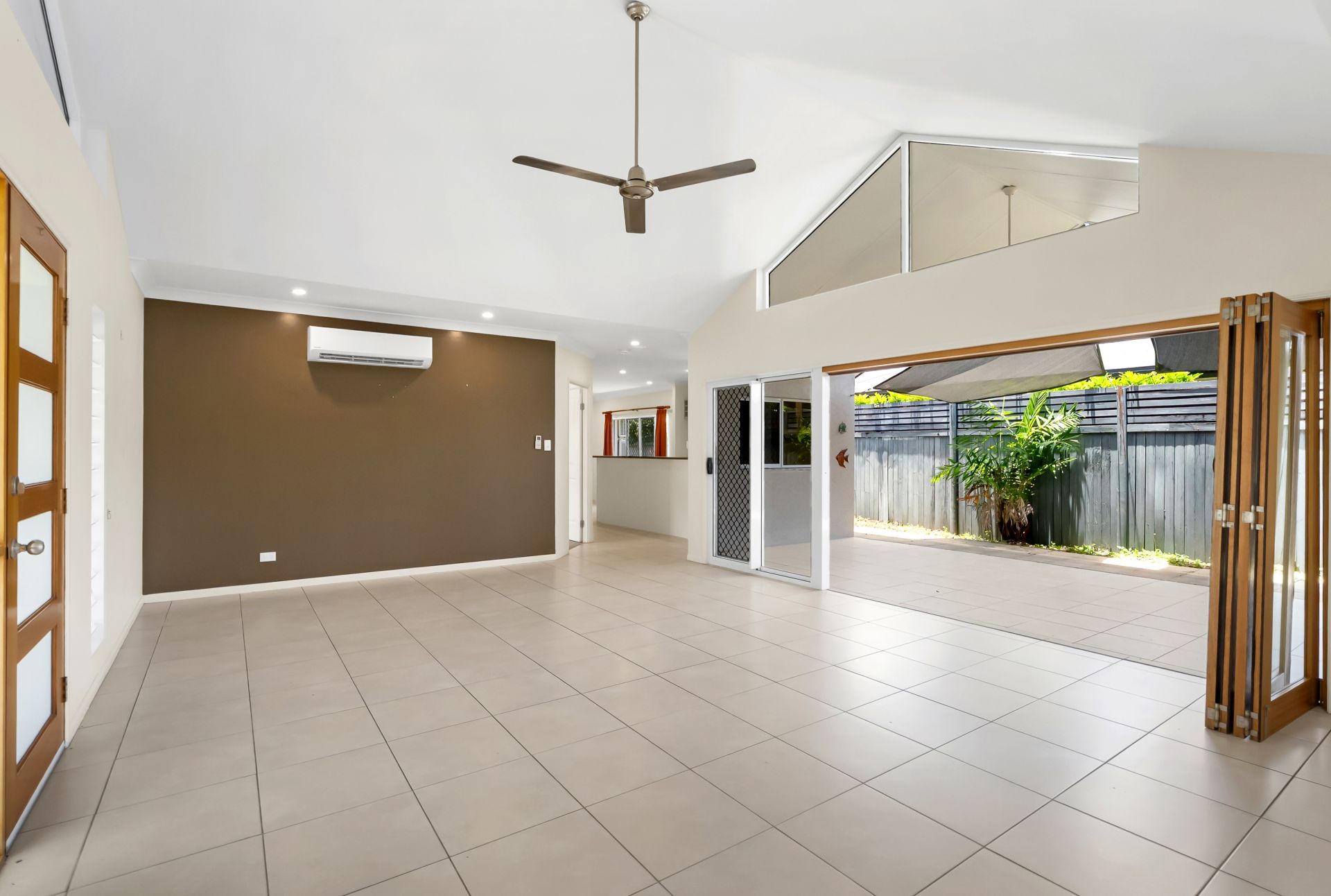 The home opens to a light-filled living space enhanced by soaring cathedral ceiling in the main living space and an effortless indoor / outdoor connection with bi-fold doors extend the living area to a private, covered patio, creating an inviting setting for alfresco dining and year round entertaining.