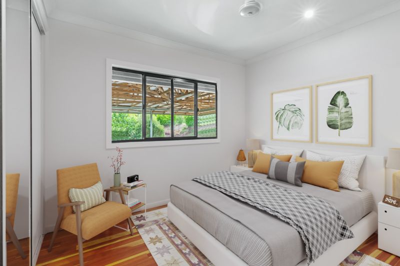 -Master suite with ceiling fans, built-in wardrobe, double shower ensuite, and mountain views to the west