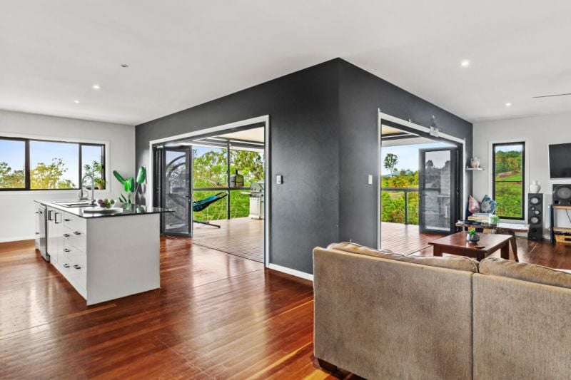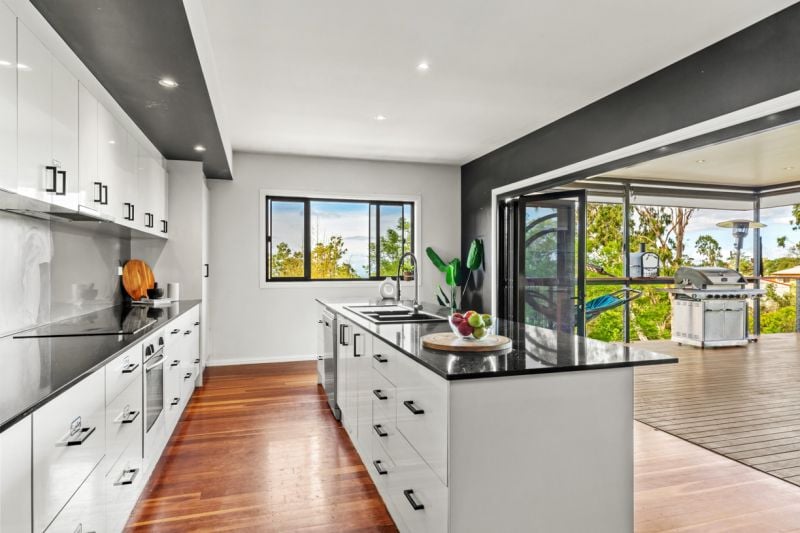 -Contemporary open-plan design connecting kitchen, living areas, and deck-ideal for entertaining